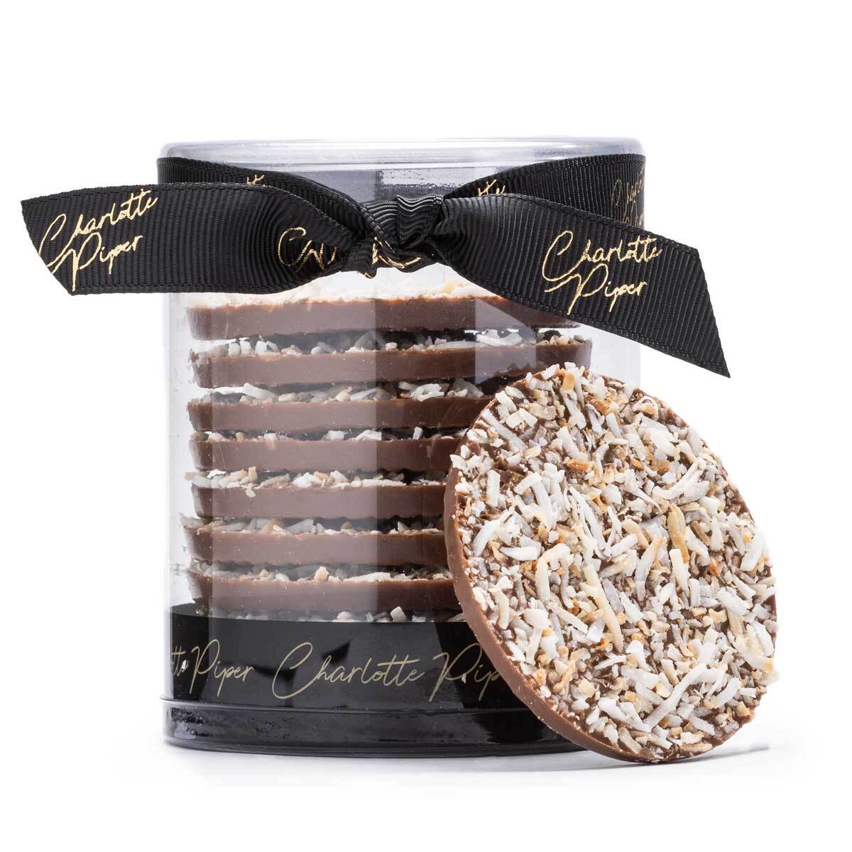 Thin Disc of Milk Chocolate Topped with coconut, presented in a clear cylinder