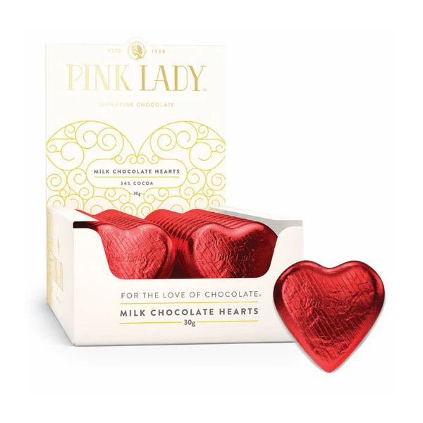 Pink Lady Milk chocolate flat heart wrapped in Red foil.