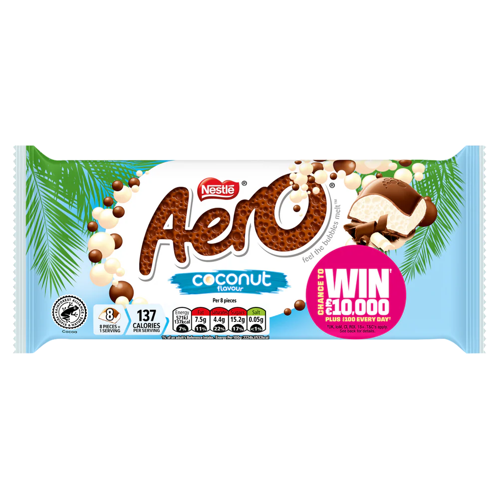 Indulge in Aero Coconut Block Chocolates – 15 delicious 90g bars filled with bubbly coconut-flavoured milk chocolate. Crafted with Nestlé’s signature aerated chocolate, these bars melt effortlessly in the mouth and offer a tropical twist in every bite. Ideal for sharing, gifting, or retail resale, each bar is individually price-marked and made with Rainforest Alliance Certified cocoa. With no artificial colours, flavours, or preservatives, this bubbly chocolate is a guilt-free treat for coconut lovers.