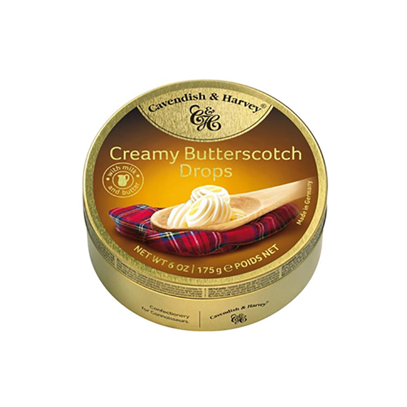 Creamy Butterscotch Drops, made with milk and butter then dusted in icing sugar. Sealed in a premium gold tin