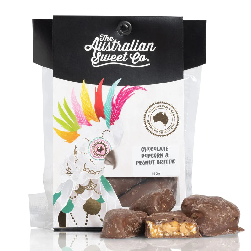 Popcorn and roasted peanuts in sweet brittle and coated in smooth milk chocolate