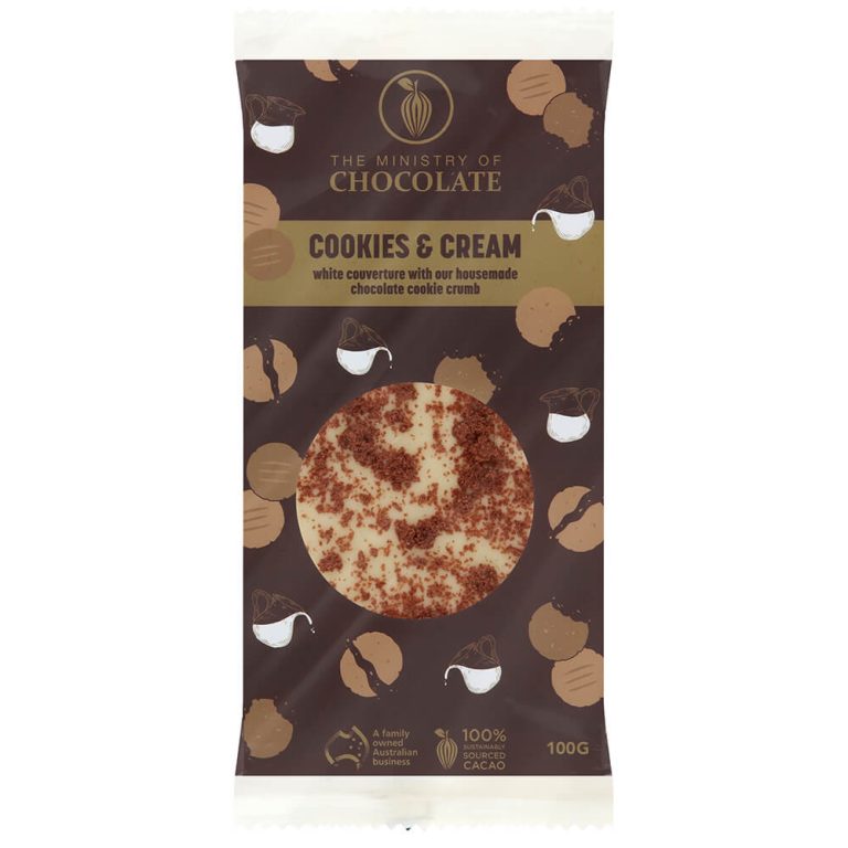 White couverture bar, with our gluten and egg free chocolate cookies on top.