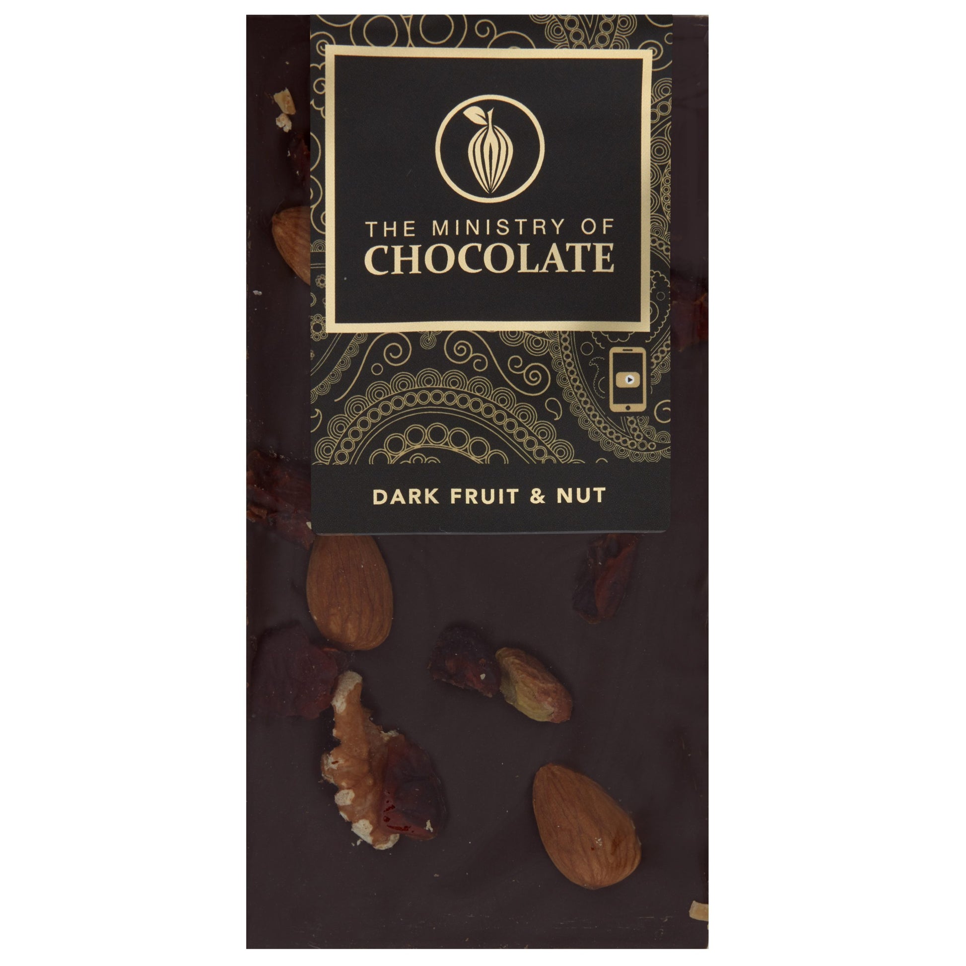 Dark couverture bar, with mixed roasted nuts and dried fruit.