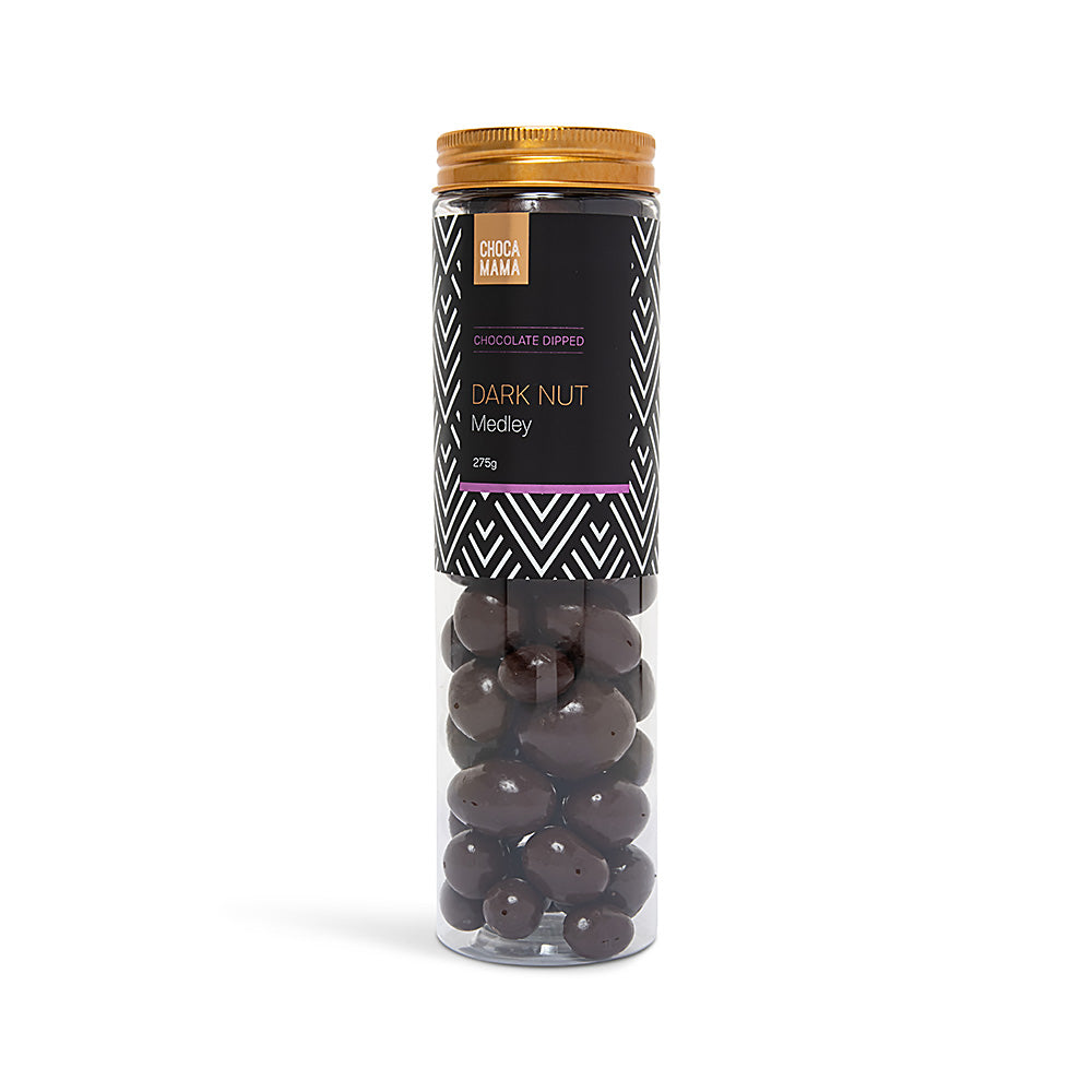 Nut selection includes almonds, macadamias, peanuts, cashews and hazelnuts coated in dark chocolate.