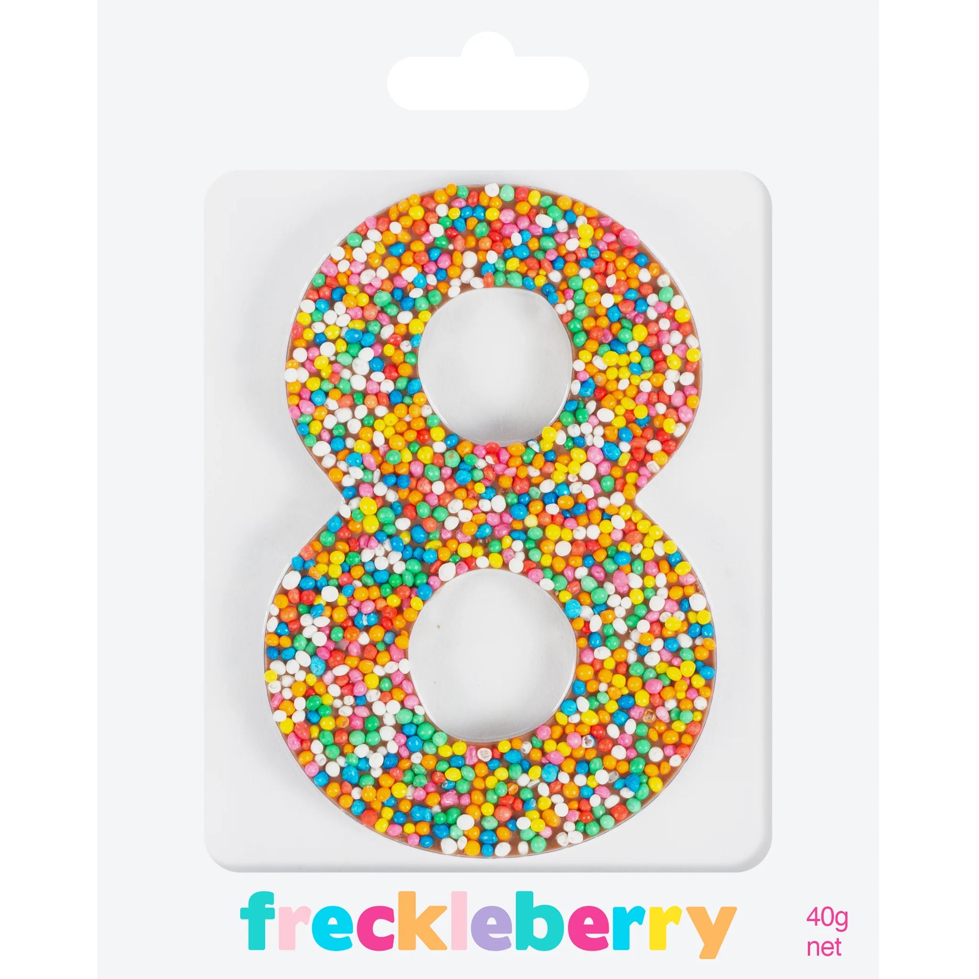 Belgian milk chocolate number '8', covered with a rainbow of coloured sprinkles. Approx size: 10cm x 6cm. Weight 40g.