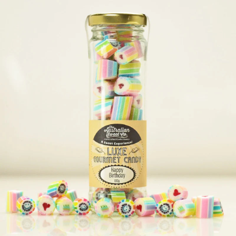 Handcrafted and cute Happy Birthday sweets with a gorgeous mixture of bright rainbow colours with a mix of Happy Birthday text, rainbow cake image and hearts and a delicious watermelon flavour.