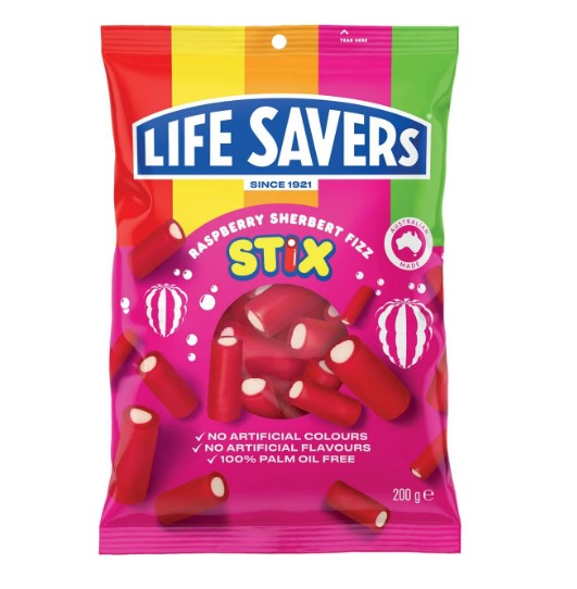 Soft, tangy raspberry favoured tubes with a fizzy sherbet centre