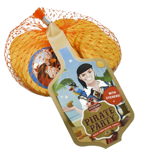 Pirate Party Milk Chocolate Coins in mesh bag with collectible stickers.