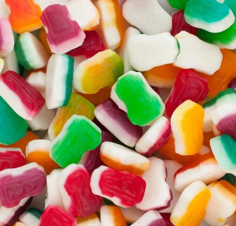 Ingredients: Glucose (WHEAT/maize), Sugar, Starch, (WHEAT), citric acid (330), sodium citrate (331), Gelatine, Glycerine, Flavours, Colours (102,110,122,133), coconut oil, beeswax, carnauba wax