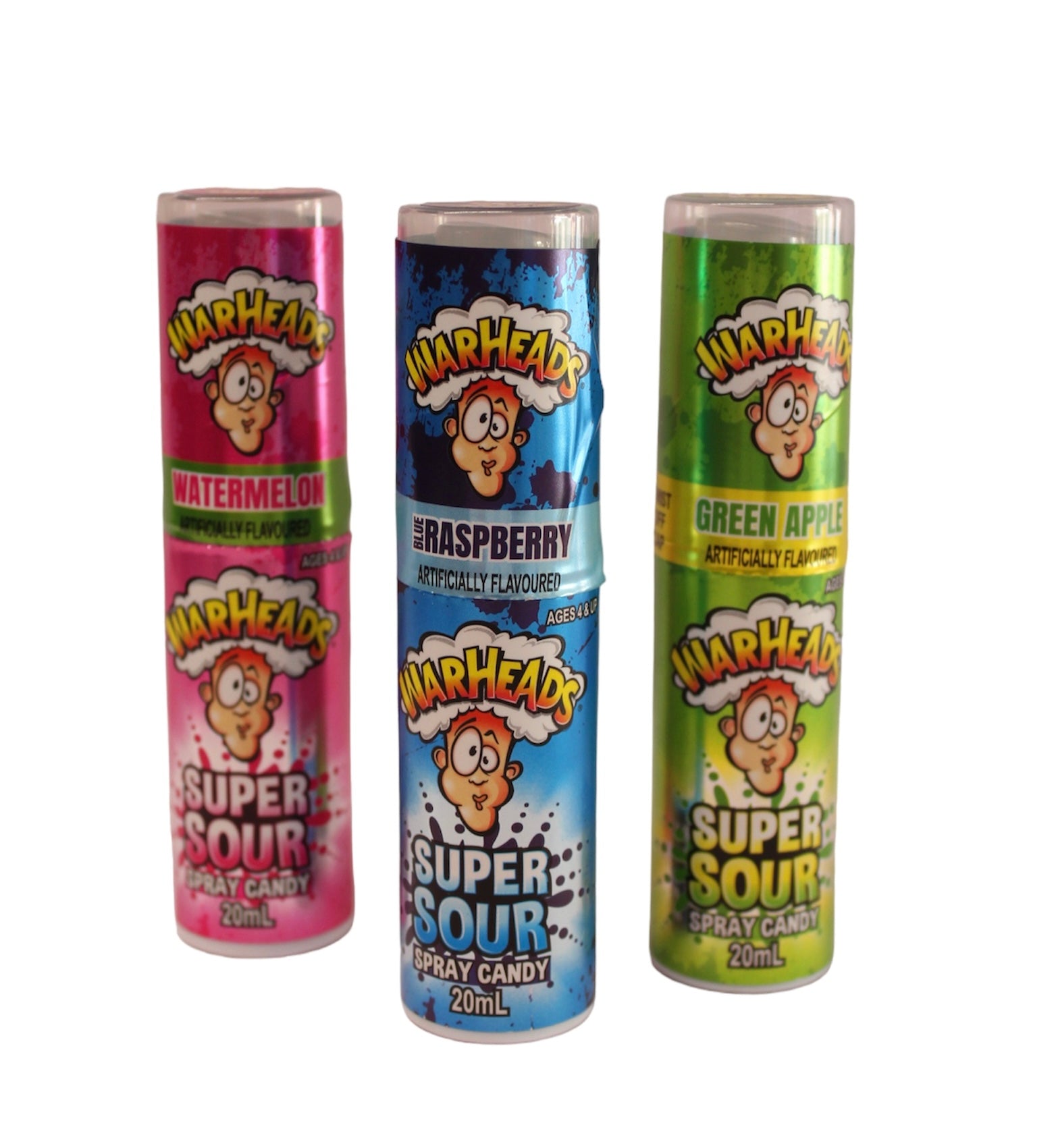 Warhead Super Sour Spray Candy comes in 3 assorted flavoured spray candy, Green apple, Watermelon and Blue Raspberry.