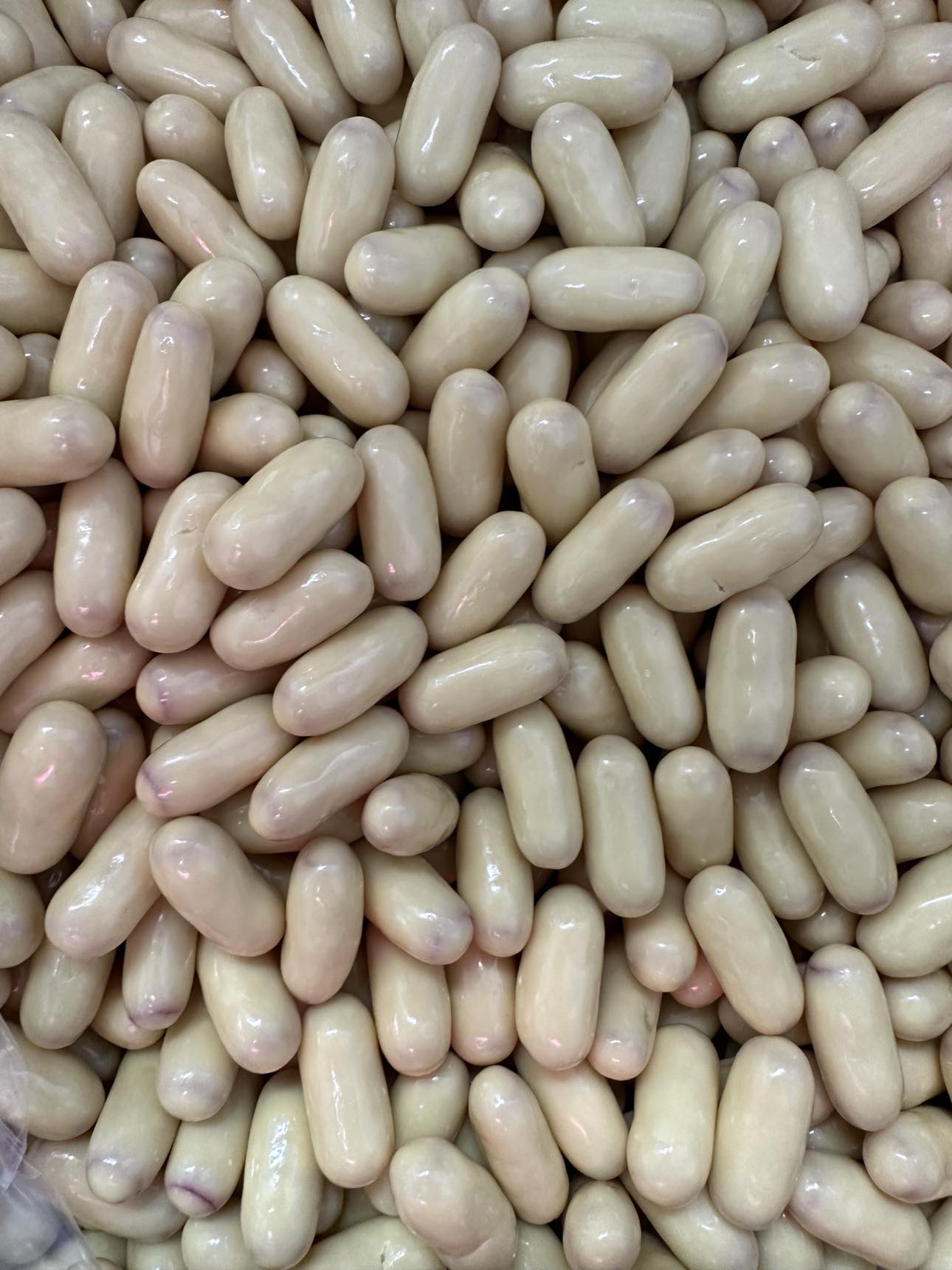 Raspberry Licorice Pieces Coated in White Chocolate.