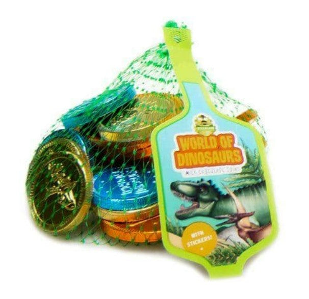 Indulge in some prehistoric fun with these dino-tastic milk chocolate coins with playful stickers!